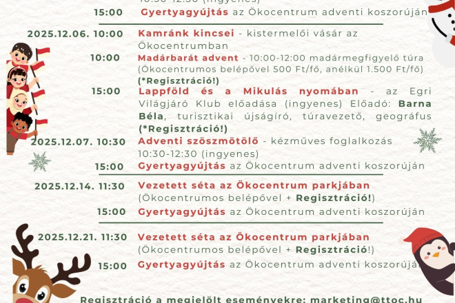 2025.12.21. 11:30 – Vezetett séta az Ökocentrum parkjában (Ökocentrummos belépővel + Regisztráció!) 15:00 – Gyertyagyújtás az Ökocentrum adventi koszorúján