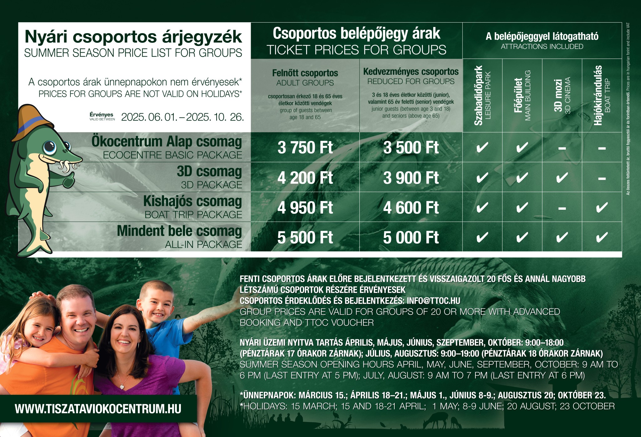 (a nyári üzemi időszakban a "Kishajós csomag" és "Mindent bele" belépőjegyekhez naponta változó színű karszalagot adunk, mellyel a Tisza-tavi Ökocentrum kikötőjének megközelítését a 3.sz. Tisza-tó gát felőli kapun keresztül, a kishajós kiránduláson való részvételt, majd azt követően az Ökocentrum területére történő visszatérést biztosítjuk)