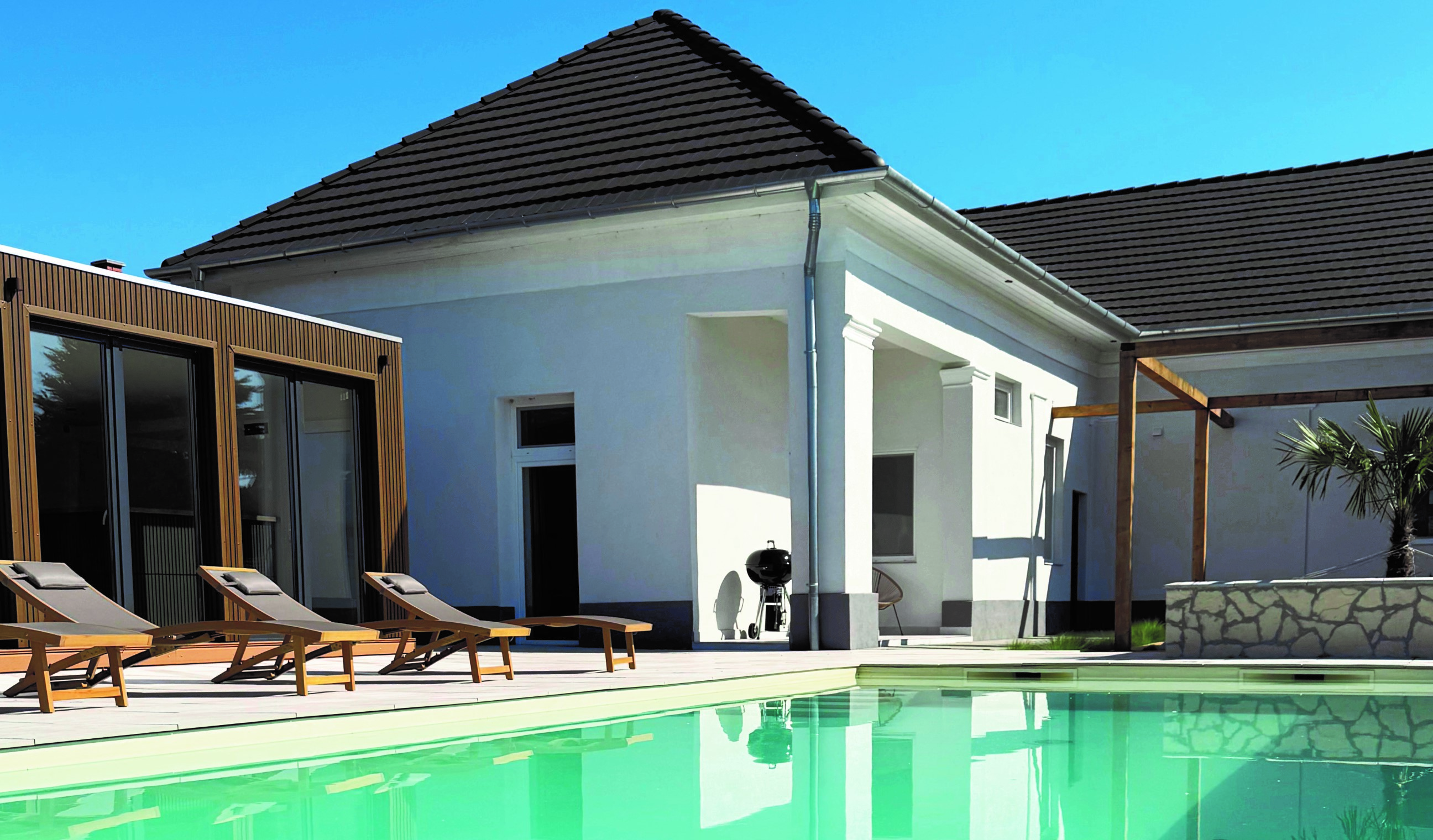 A tágas kert igazi privát oázis: saját parkolóval, kellemes kiülőrésszel, valamint lenyűgöző sós vizű medencével, napozóterasszal és stílusos medenceházzal — tökéletes helyszín felejthetetlen, csillagfényes estékhez.
