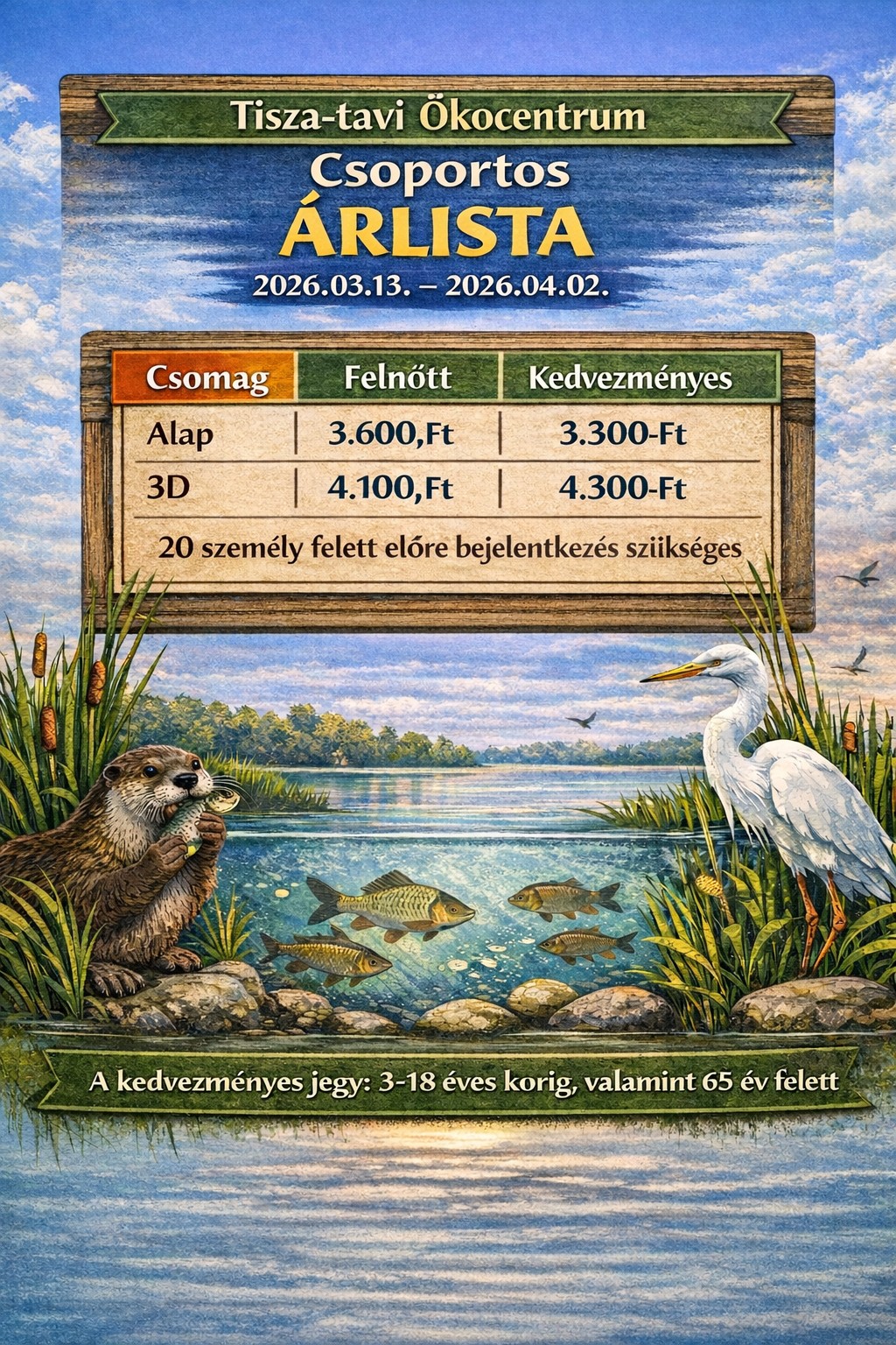Minden amit az Ökocentrum Alap csomag tartalmaz + 45-50 perc időtartamú kishajós kirándulás a Tisza-tavon (12 fős kishajók, óránkénti indulás).