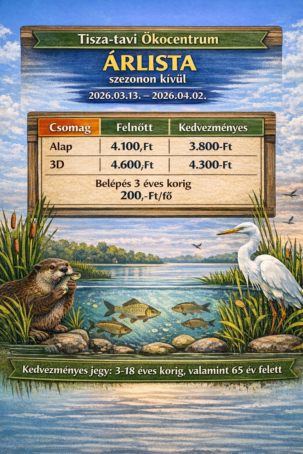 Minden amit az Ökocentrum Alap csomag tartalmaz + 12 perces, "Négy évszak a Tisza-tavon" című 3d természetfilm megtekintése a főépület földszintjén található moziteremben (vetítés kezdete félóránként, minden óra egészkor és fél órakor).