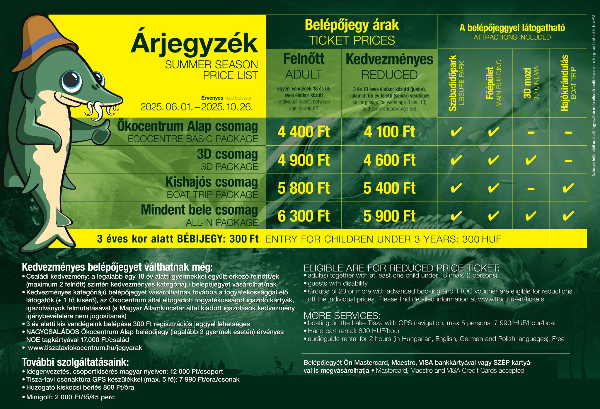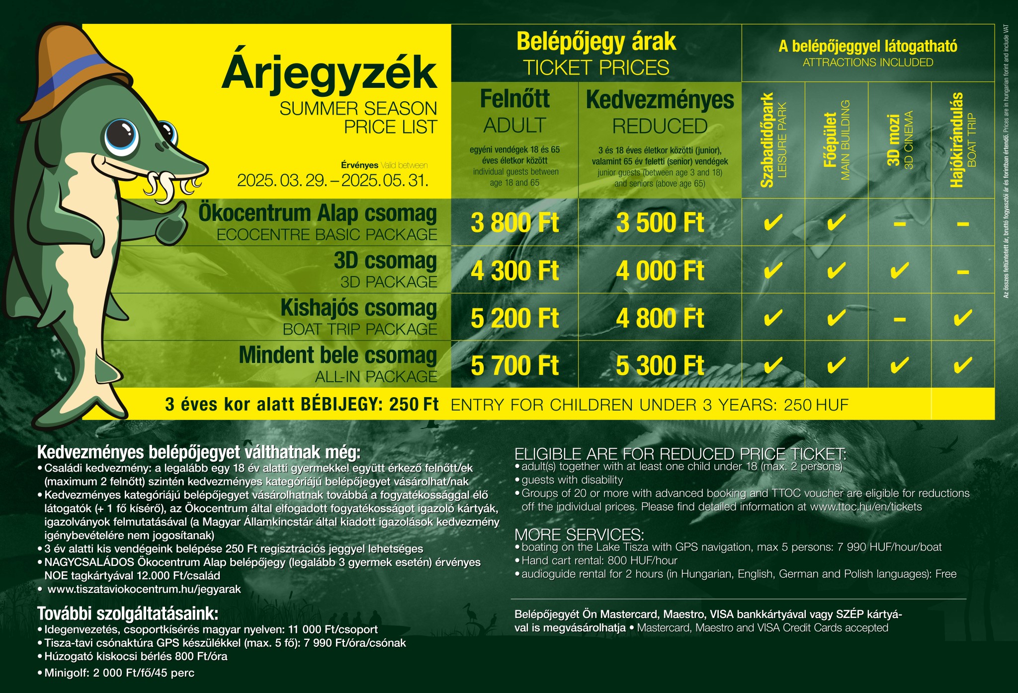 (a nyári üzemi időszakban a "Kishajós csomag" és "Mindent bele" belépőjegyekhez naponta változó színű karszalagot adunk, mellyel a Tisza-tavi Ökocentrum kikötőjének megközelítését a 3.sz. Tisza-tó gát felőli kapun keresztül, a kishajós kiránduláson való részvételt, majd azt követően az Ökocentrum területére történő visszatérést biztosítjuk)