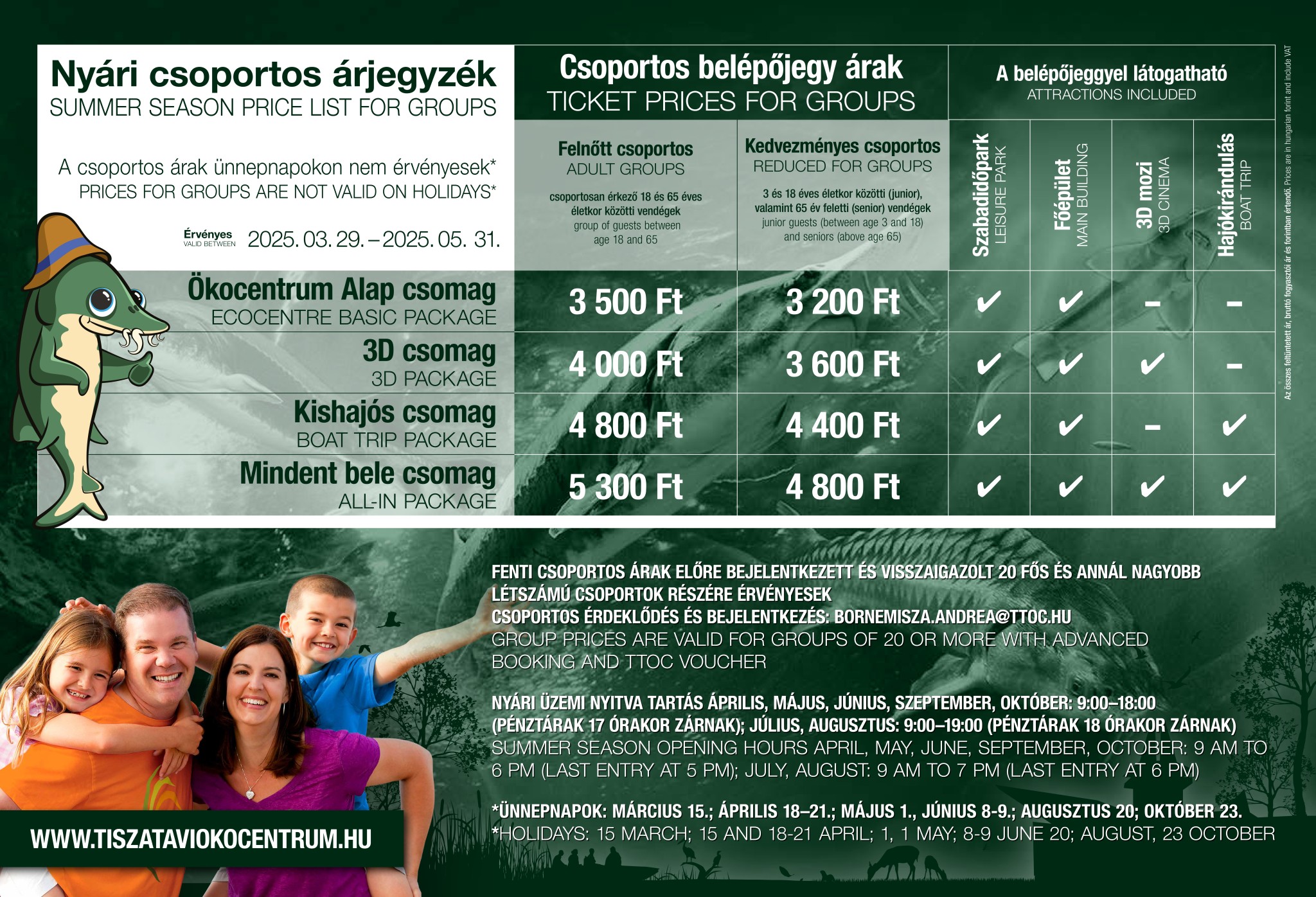 Minden amit az Ökocentrum Alap csomag tartalmaz + 12 perces, "Négy évszak a Tisza-tavon" című 3d természetfilm megtekintése a főépület földszintjén található moziteremben (vetítés kezdete félóránként, minden óra .00 és .30 perckor) + 45-50 perc időtartamú kishajós kirándulás a Tisza-tavon